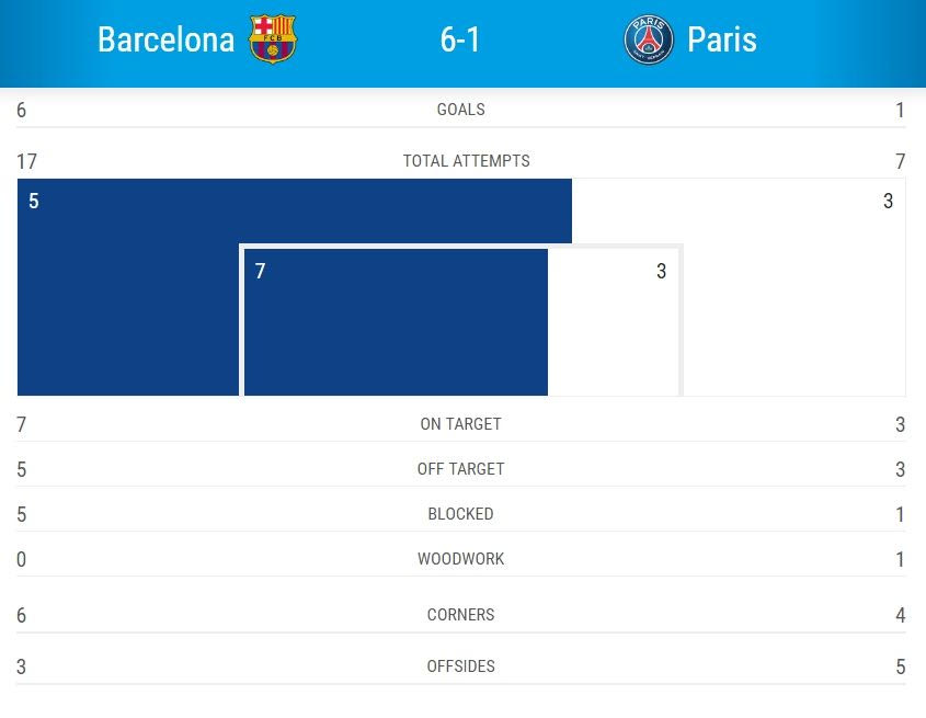 Ρίχνοντας μια ματιά στα στατιστικά του αγώνα, προκαλεί εντύπωση η ομοιότητα με τα στατιστικά ενός άλλου ματς, εκείνου της Τετάρτης (8/3) για το Champions League για το οποίο μιλάει όλη η Ευρώπη. Ο λόγος για το Μπαρτσελόνα – Παρί Σεν Ζερμέν 6-1. Παρά την πολύ μεγάλη διαφορά στα σκορ, τα στατιστικά είναι σχεδόν ίδια!