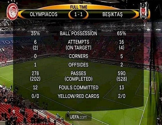 Κι όμως αν ρίξει κανείς μια ματιά στα στατιστικά του αγώνα Ολυμπιακός-Μπεσίκτας (1-1) και Μπαρτσελόνα-Παρί Σεν Ζερμέν (6-1) θα βρει πολλά κοινά.
