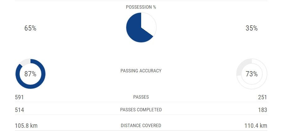 Το καλύτερο βέβαια ήταν το ποσοστό στις εύστοχες πάσες. Η Μπαρτσελόνα στο παιχνίδι της επιχείρησε 591 πάσες με τις 514 να είναι εύστοχες. Ένα ποσοστό δηλαδή που αγγίζει το 87%.