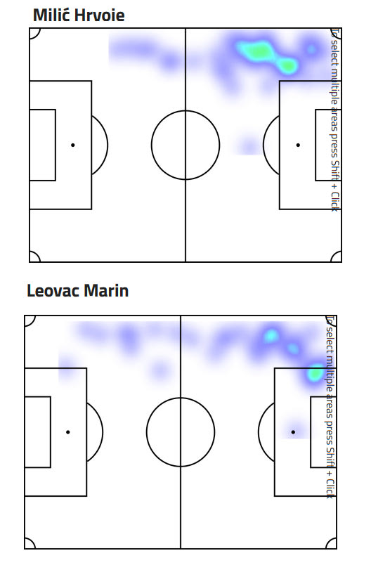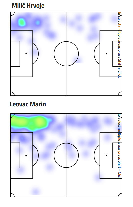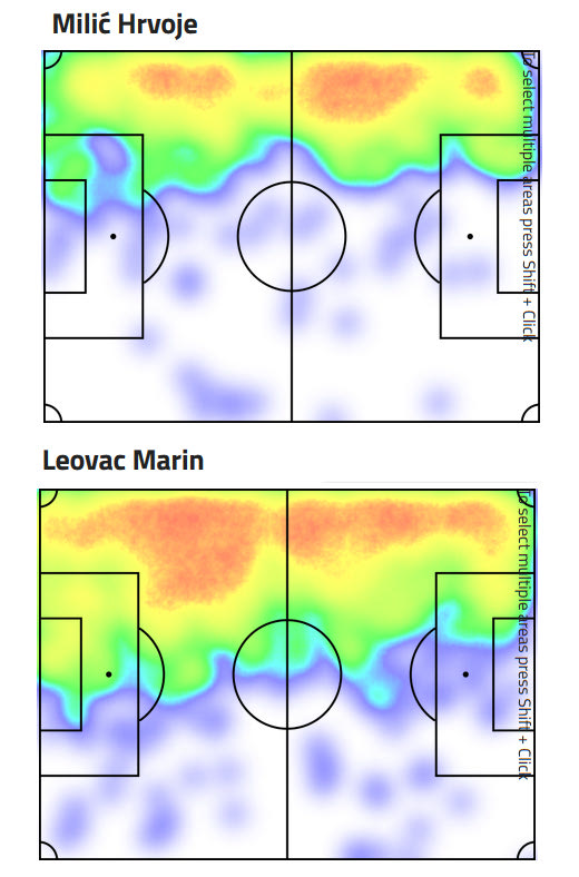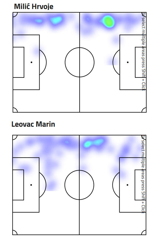 Σε επίπεδο γεμισμάτων, ο Μίλιτς κατέγραψε 5,4 ανά 90λεπτο, με ποσοστό επιτυχίας στο 20%, ενώ ο Λέοβατς είχε 3,5 ανά 90λεπτο, με ποσοστό επιτυχίας στο 32%. Ο θερμικός τους χάρτης είναι σχεδόν παρόμοιος, με τον Λέοβατς να έχει αρκετά γεμίσματα σε πιο πίσω μέτρα από ότι ο Μίλιτς.