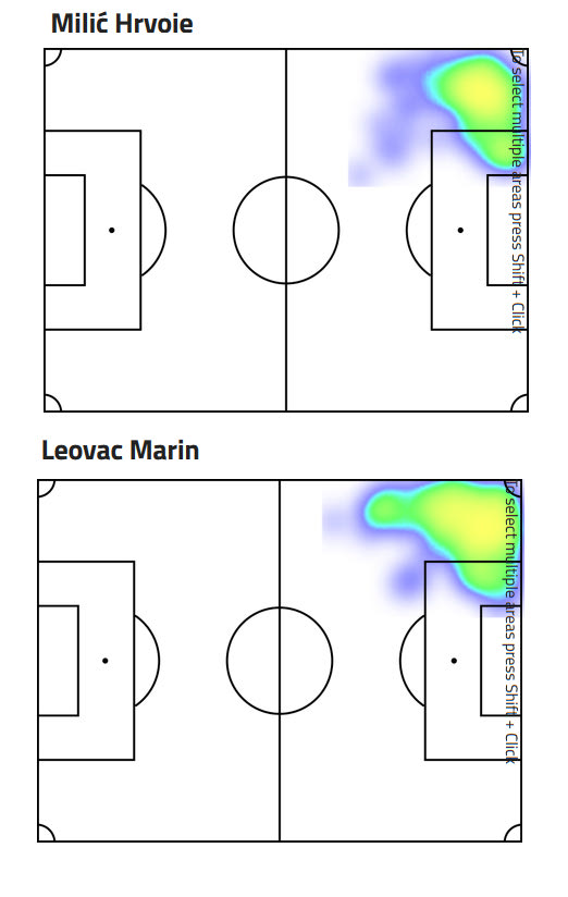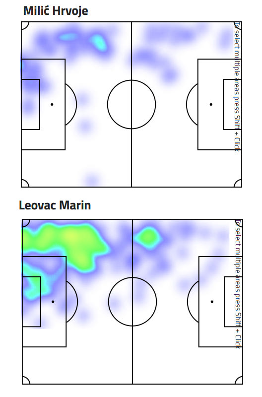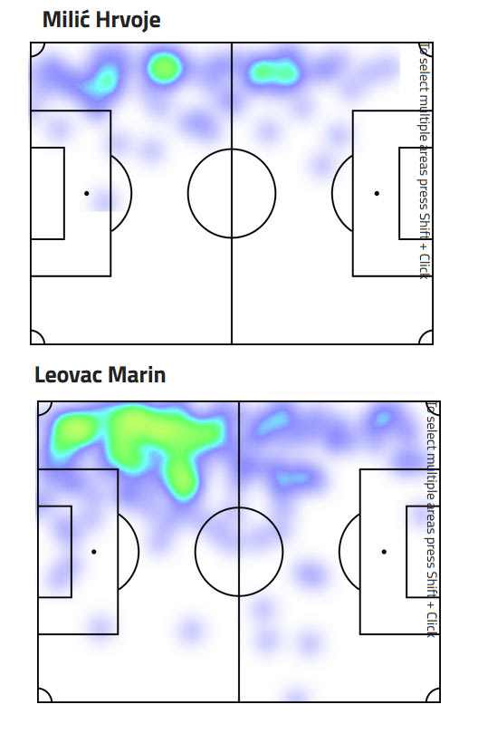 Ο θερμικός χάρτης καταδεικνύει για μια ακόμα φορά τις διαφορές στο σύστημα στο οποίο αγωνιζόταν οι δυο παίκτες,με τον Μίλιτς, ως φουλ μπακ να έχει κάτω από τη μεσαία γραμμή μεγαλύτερη δραστηριότητα από τον Λέοβατς.