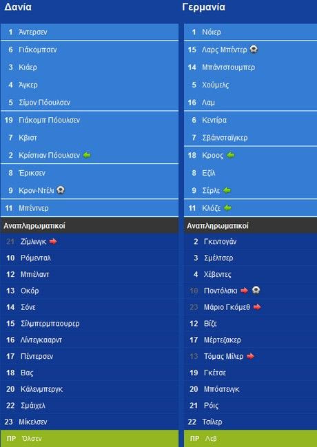 Η Δανία διεκδίκησε τις πιθανότητές της, αλλά η ήττα 2-1 από τη Γερμανία σε συνδυασμό με τη νίκη της Πορτογαλίας επί της Ολλανδίας την άφησαν στην τρίτη θέση του Β' Ομίλου και εκτός συνέχειας. Κορυφή με το απόλυτο για τα "πάντσερ" που αντιμετωπίζουν την ερχόμενη Παρασκευή την Ελλάδα στο δεύτερο προημιτελικό.