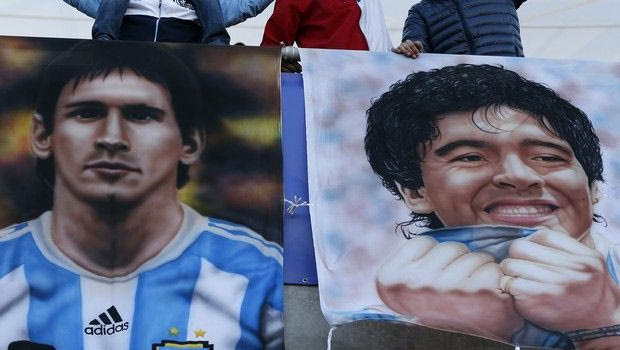 Argentina supporters react as the stand next to pictures depicting Diego Maradona, right, and Lionel Messi before a Copa America Group B soccer match between Argentina and Paraguay at La Portada stadium in La Serena, Chile, Saturday, June 13, 2015. (AP Photo/Andre Penner)