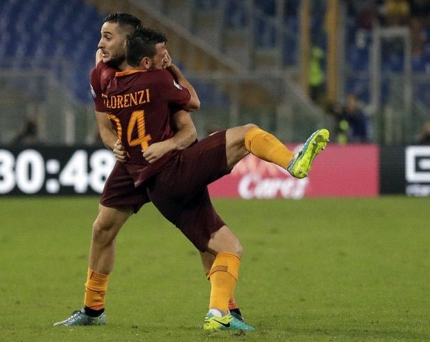 Romas Kostas Manolas, left, celebrates with teammate Alessandro Florenzi after scoring, during a Serie A soccer match between Roma and Inter Milan, at Rome's Olympic Stadium, Sunday, Oct. 2, 2016. (AP Photo/Andrew Medichini) AP