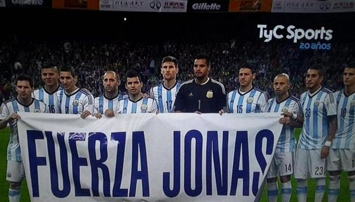 Οι συμπαίκτες του στην εθνική Αργεντινής δεν τον ξέχασαν. Κατά την ανάκρουση του εθνικού ύμνου πριν το φιλικό με τη Βραζιλία παρατάχθηκαν, κρατώντας ένα πανό που έγραφε “Δύναμη Γιόνας”, στέλνοντας κι αυτοί από την πλευρά τους μήνυμα συμπαράστασης.