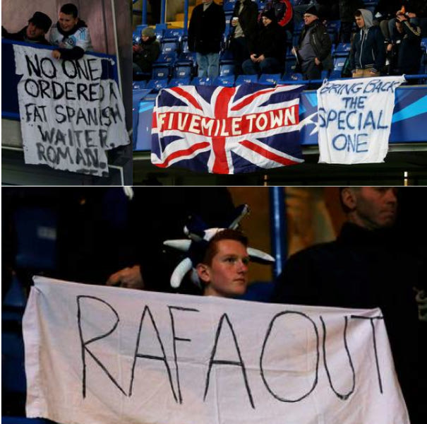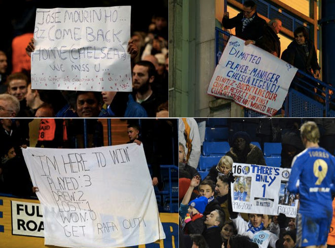 Οι φίλοι των “μπλε” ύψωσαν ουκ ολίγα πλακάτ με μηνύματα διαμαρτυρίας για την έλευση του Μπενίτεθ στον πάγκο της ομάδας. Άλλοι προέτρεψαν τον Αμπράμοβιτς να φέρει πίσω τον Μουρίνιο ενώ υπήρξαν και πάμπολλα μηνύματα συμπαράστασης στον Ντι Ματέο ο οποίος είδε τον προηγούμενο μήνα την πόρτα της εξόδου από την ομάδα.