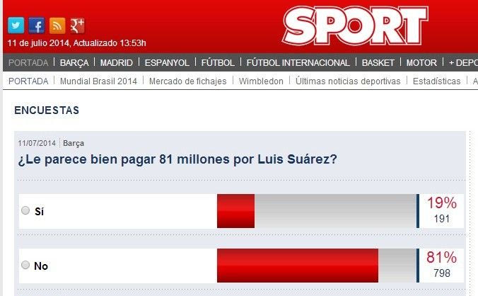 Η καταλανική “Sport” αμέσως μετά την ανακοίνωση της απόκτησης του Λουίς Σουάρες από τη Μπαρτσελόνα ανέβασε στο σάιτ της ψηφοφορία, ρωτώντας τους αναγνώστες της αν συμφωνούν με τα χρήματα που δαπάνησαν οι “μπλαουγκράνα” προκειμένου να αποκτήσουν τον Ουρουγουανό επιθετικό.