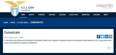 Ανακοίνωση με την οποία διαψεύδει όσα είπε ο πρόεδρός της, Κλαούντιο Λοτίτο, σχετικά με την πώληση του Φελίπε Άντερσον στη Μάντσεστερ Γιουνάιτεντ εξέδωσε η Λάτσιο.