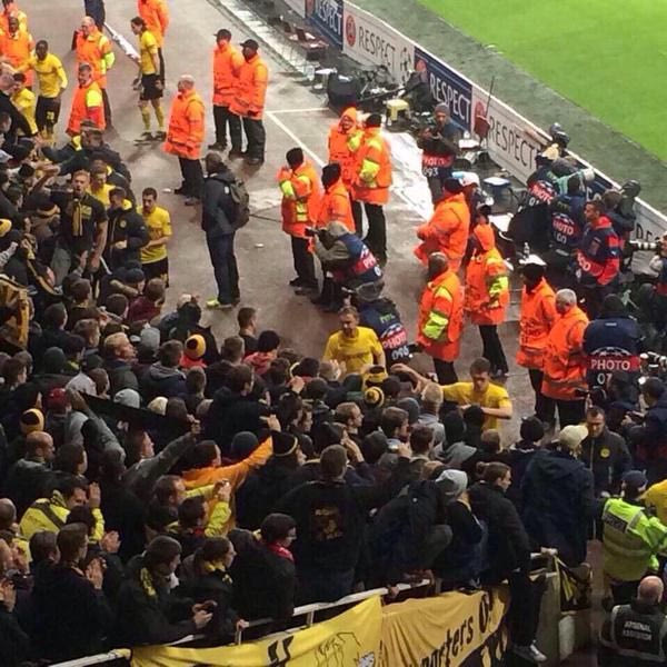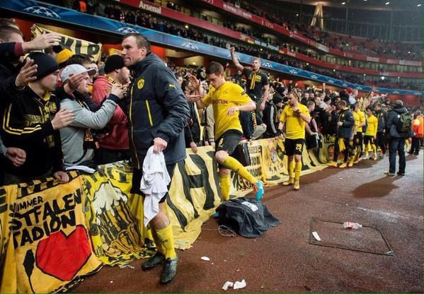 Περίπου 4.000 Γερμανοί βρέθηκαν στις κερκίδες του “Έμιρεϊτς”, δημιουργώντας μια ωραία ατμόσφαιρα και οι παίκτες της Ντόρτμουντ θέλησαν να τους ευχαριστήσουν μετά το τέλος του αγώνα με το δικό τους τρόπο.