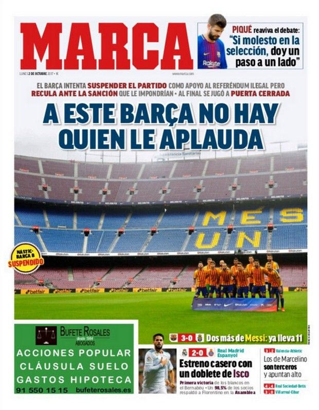 Η “Marca” έχει αποδείξει πως παρά το γεγονός ότι είναι φίλα προσκείμενη στην Ρεάλ Μαδρίτης δεν “κλείνει τα μάτια” όταν υπάρχουν θέματα στην αθλητική επικαιρότητα που χρήζουν της προσοχής της και το απέδειξε με τον πλέον πανηγυρικό τρόπο την ημέρα του δημοψηφίσματος για την ανεξαρτησία της Καταλωνίας.