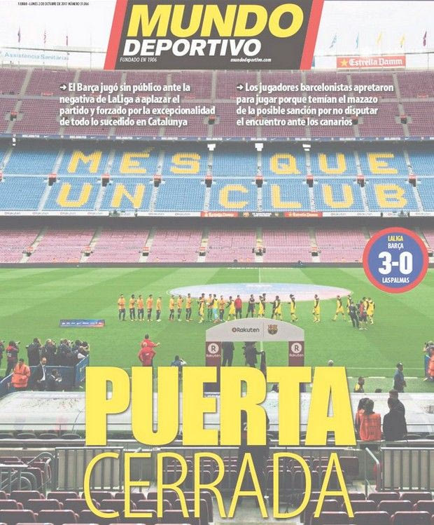 Η Μπαρτσελόνα αγωνίστηκε κεκλεισμένων των θυρών τη μέρα του δημοψηφίσματος και η "Marca" την είχε πρώτο θέμα αφήνοντας λίγο χώρο για την... Ρεάλ Μαδρίτης!