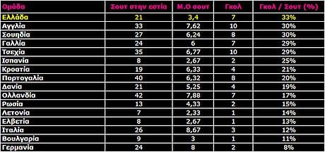 Η κατάκτηση του Euro ήταν το επιστέγασμα της ομαδικότητας και της εκπληκτικής ανασταλτικής αντιμετώπισης των αντιπάλων. Ωστόσο, η διατήρηση του μηδέν στην άμυνα δεν αρκεί για να χαρίσει προκρίσεις και τρόπαια. Ως εκ τούτου, μπορεί ο Ζαγοράκης να στέφθηκε MVP της διοργάνωσης και να αφιερώθηκαν τόνοι μελάνι για την εξύμνηση της υποδειγματικής αμυντικής λειτουργίας αλλά τίποτα δε θα είχε συμβεί αν δεν υπήρχε το… απίστευτο ποσοστό τελειωμάτων. Η εθνική μας κατάφερε να αξιοποιήσει στο έπακρο τις ευκαιρίες που δημιούργησε και να «κερδίσει» με διαφορά στην στατιστική κατηγορία των γκολ/σουτ. Φυσικά, στο ποδόσφαιρο τίποτα δεν είναι τυχαίο (επαναλαμβανόμενη σύμπτωση παύει να είναι σύμπτωση) αλλά αυτό δε σημαίνει ότι εκείνη την περίοδο ο… Θεός δεν ήταν Έλληνας.
