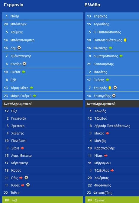 Ο Τζαβέλλας άρχισε παρά το πρόβλημα που παρουσιάστηκε με τον δικέφαλό του, ο Νίνης μπήκε αντί του Γκέκα και ο Μάκος αντί του Καραγκούνη και η Ελλάδα είχε την ενδεκάδα που στη θεωρία θα μπορούσε να βγάλει κάτι. Στην πράξη, όμως, αν εξαιρέσουμε ένα σουτ του Νίνη που μπλόκαρε εύκολα ο Νόιερ, δεν είδαμε κάτι άλλο.