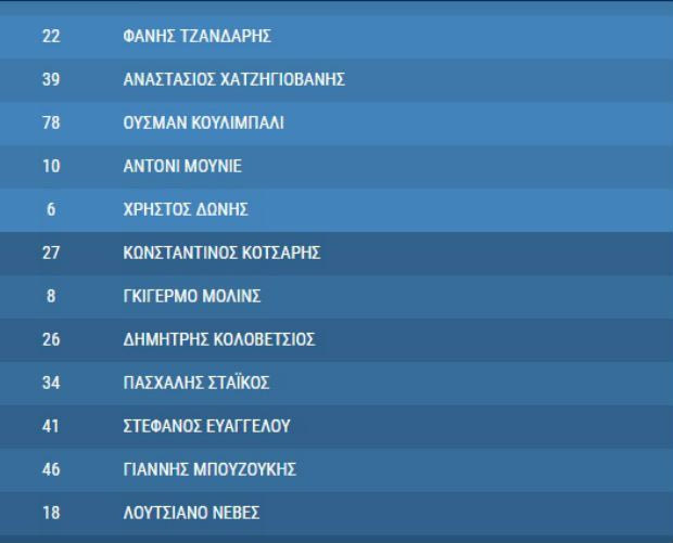 Αναλυτικά η ενδεκάδα: Διούδης, Ινσούα, Αυλωνίτης, Κουρμπέλης, Γιόχανσον, Λουντ, Τζανδάρης, Χατζηγιοβάνης, Κουλιμπαλί, Μουνιέ, Δώνης.
