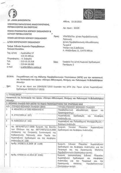Ο Δήμαρχος Νέας Φιλαδέλφειας στο χθεσινό δημοτικό συμβούλιο προσέγγισε ξανά το θέμα του γηπέδου της ΑΕΚ με τη γνωστή αρνητική του στάση, ωστόσο στην ουσία της όλης υπόθεσης, το σημαντικό είναι ότι η “Δικέφαλος 1924” πήρε στα χέρια της την έγκριση της Μελέτης Περιβαλλοντικών Επιπτώσεων από τη τη Γενική Γραμματεία του Υπουργείου Περιβάλλοντος και τη γενική διεύθυνση χωρικού σχεδιασμού και αστικού περιβάλλοντος.