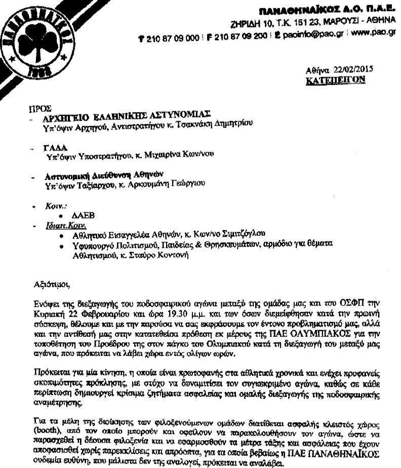 Η ΠΑΕ Παναθηναϊκός έδωσε στη δημοσιότητα την επιστολή που έστειλε με την το μεσημέρι της Κυριακής προς το Αρχηγείο της Ελληνικής Αστυνομίας, τη ΓΑΔΑ, τη ΔΕΑΒ, τον Σταύρο Κοντονή και τον Αθλητικό Εισαγγελέα, Κων/νο Σιμιτζόγλου.