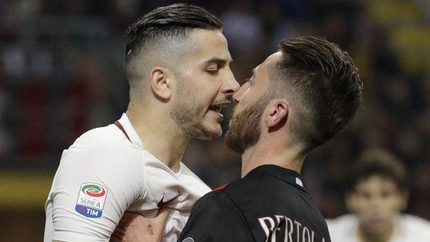 Roma's Kostas Manolas, left, and AC Milan's Andrea Bertolacci argue during an Italian Serie A soccer match between AC Milan and Roma, at the San Siro stadium in Milan, Italy, Sunday, May 7, 2017. (AP Photo/Luca Bruno) AP