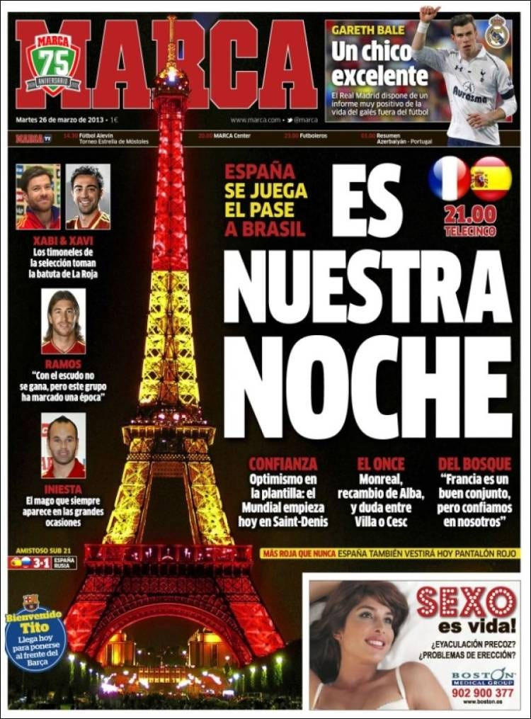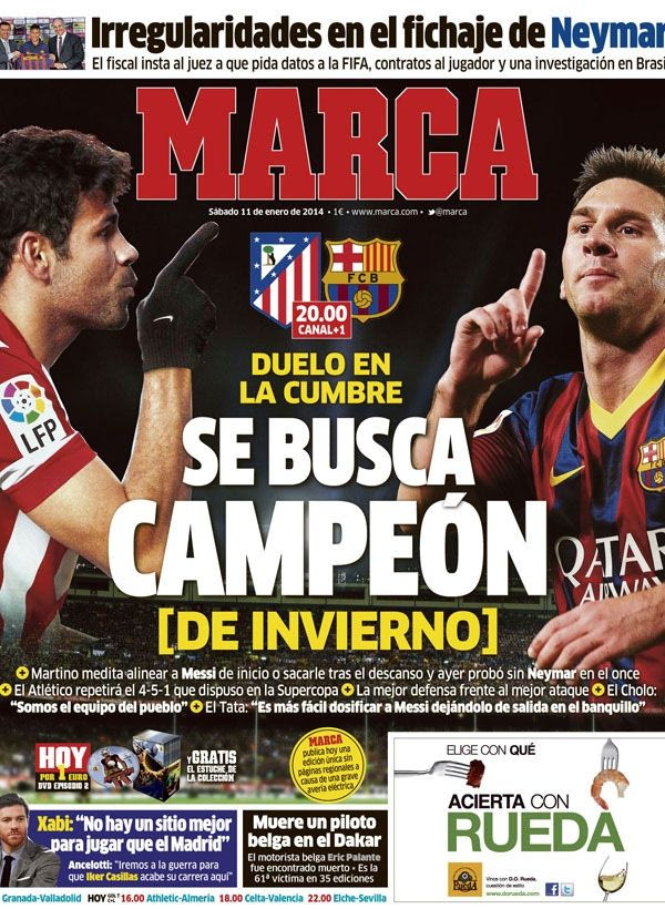 Η ισπανική εφημερίδα "Marca" με ένα εντυπωσιακό πρωτοσέλιδο, έβαλε για τα καλά τους αναγνώστες της στο κλίμα του derbi madrileño, μεταξύ Ρεάλ και Ατλέτικο Μαδρίτης, για τον δεύτερο αγώνα της προημιτελικής φάσης του Champions League. Θυμηθείτε παλαιότερα εντυπωσιακά πρωτοσέλιδα της.