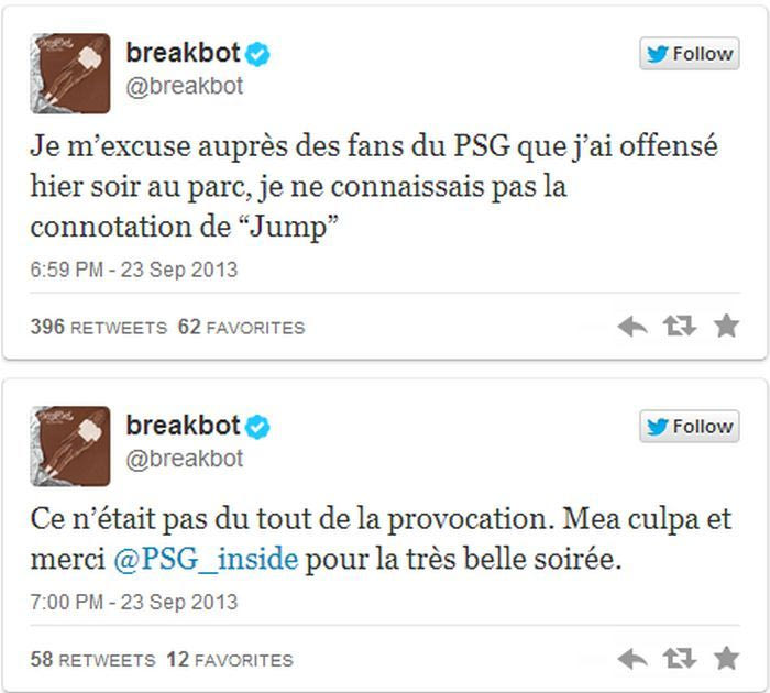 “Απολογούμαι στους φιλάθλους της Παρί που τους πρόσβαλα χθες το βράδυ στο γήπεδο. Δεν ήξερα τη σύνδεση του “Jump”. Δεν ήταν προβοκάτσια. Eυχαριστώ την Παρί για την υπέροχη βραδιά”, έγραψε χαρακτηριστικά.