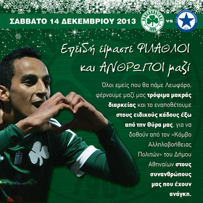 Η ανακοίνωση της ΠΑΕ: “Η ΠΑΕ Παναθηναϊκός καλεί τους φίλους της ομάδας που θα βρεθούν στη Λεωφόρο για να παρακολουθήσουν την αναμέτρηση Παναθηναϊκός – Ατρόμητος, το Σάββατο 14 Δεκεμβρίου 19:30, να συμβάλουν όσο μπορούν στη συλλογή τροφίμων μακράς διαρκείας, για τους συνανθρώπους μας που δοκιμάζονται τις δύσκολες αυτές ημέρες.