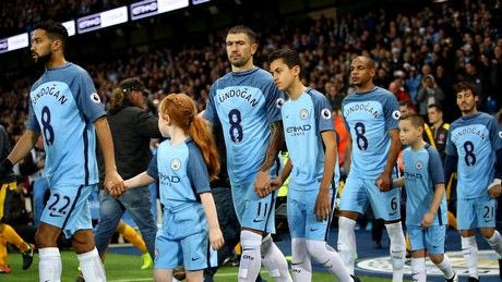 MANCHESTER, ENGLAND - DECEMBER 18: Aleksander Kolorov of Manchester City and his Manchester City team mates wear Ilkay Gundogan of Manchester City shirt in surport for him after he was injured during the Premier League match between Manchester City and Arsenal at the Etihad Stadium on December 18, 2016 in Manchester, England. (Photo by Clive Brunskill/Getty Images) Getty Images