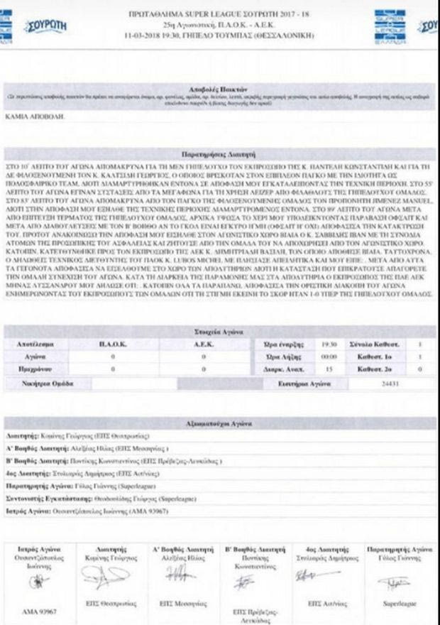 Αναλυτικά τα όσα αναφέρονται στο φύλλο αγώνα: