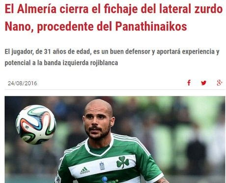 Ο Νάνο επιστρέφει στην Ισπανία για να παίξει στην Αλμερία της Segunda Division. Η ομάδα από την Ανδαλουσία ανακοίνωσε την απόκτηση του 31χρονου αριστερού μπακ του Παναθηναϊκού, ο οποίος δεν ήταν στα πλάνα του Αντρέα Στραματσόνι για την τρέχουσα σεζόν.