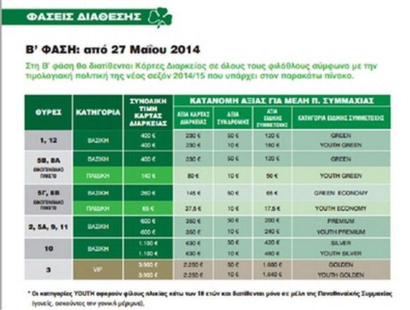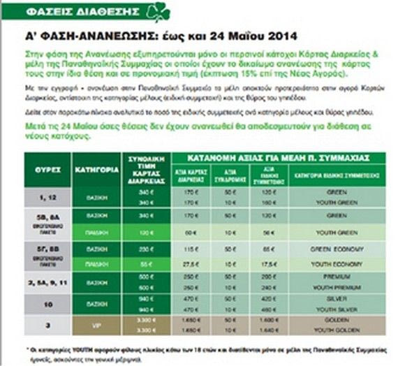 Και ενώ ισχύουν αυτά και όλες οι ομάδες συμμορφώνονται με τις άνω διατάξεις η ΠΑΕ ΠΑΝΑΘΗΝΑΙΚΟΣ μέσω του site της “Παναθηναϊκής Συμμαχίας” ανακοινώνει διαφορετικές τιμές εισιτηρίων που θα ισχύουν για τον επερχόμενο αγώνα (παράδειγμα στο παράρτημα 1 η ανακοίνωση των τιμών για τον αγώνα Παναθηναϊκός-Εργοτέλης για τις 23/11/2014).