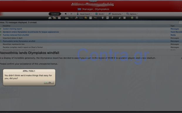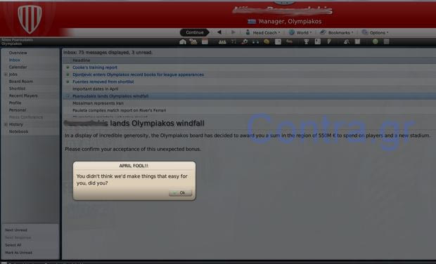 Ποιος είπε πως η πρωταπριλιά είναι μόνο για τα ΜΜΕ; Το παιχνίδι Football Manager, με το πιστό και φανατικό κοινό, έκανε απίστευτο χουνέρι σε ένα φίλο του Ολυμπιακού.
