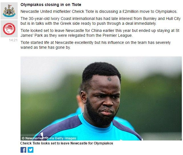 Εκτός απ’ τους δύο προαναφερθέντες, οι Πειραιώτες κινούνται για την απόκτηση του Σεΐκ Τιοτέ απ’ τη Νιούκαστλ. Ο Ιβοριανός αγωνίζεται κυρίως ως αμυντικός χαφ, αλλά κι ως εσωτερικός μέσος. Σύμφωνα με δημοσίευμα της ” Daily Mail“, ο Ολυμπιακός προσφέρει 2.400.000 ευρώ στις “καρακάξες” για τον 30χρονο άσο, με τις δύο πλευρές να βρίσκονται κοντά σε συμφωνία, παρά το ενδιαφέρον της Χαλ και της Μπέρνλεϊ.