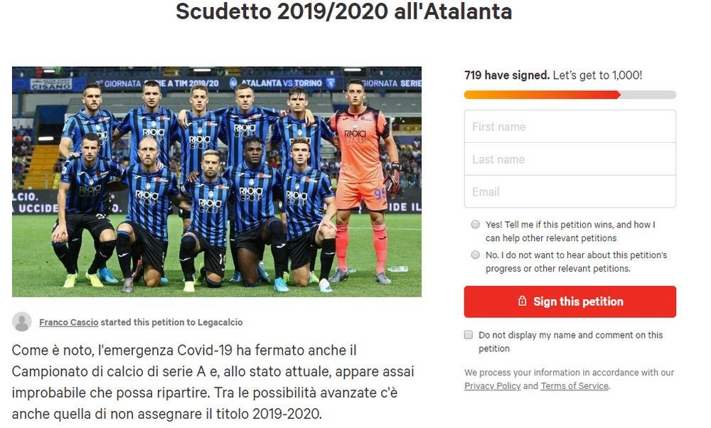 Πάνω στις δύο αυτές αντικρουόμενες συνθήκες, την εξωαγωνιστικά ματωμένη και την αγωνιστικά λαμπερή, βασίζεται η όλη προσπάθεια ενός άγνωστου χρήστη του change.org, ο οποίος επιδιώκει να στεφθεί η Αταλάντα πρωταθλήτρια Ιταλίας, δίχως να υπολογίζεται η βαθμολογική συγκομιδή. Αυθαίρετα, τιμητικά. Ο φέρων το όνομα Φράνκο Κάστσιο άνοιξε στην ειδική πλατφόρμα μια ξεχωριστή διαδικασία έτσι ώστε να μαζευτούν υπογραφές που θα στηρίξουν το αίτημά του και αναζητά υποστηρικτές.