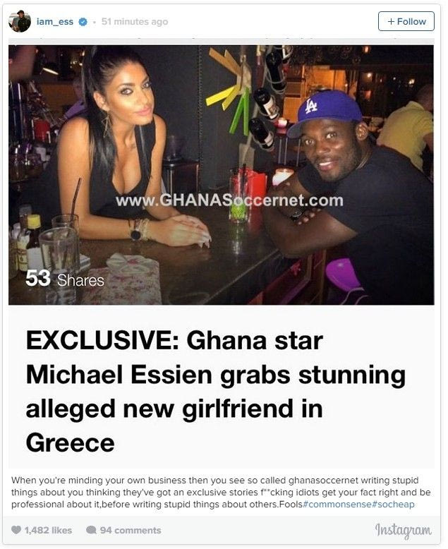 Η ιστοσελίδα ” Ghanasoccer” ανέβασε θέμα με τη φωτογραφία και τίτλο “αποκλειστικό: Ο Γκανέζος αστέρας Μάικλ Εσιέν φημολογείται ότι βρήκε την εκθαμβωτική νέα κοπέλα του στην Ελλάδα”.
