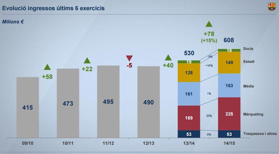 Όπως προκύπτει από τον έλεγχο της ” Deloitte“, τα έσοδα των “μπλαουγκράνα” αυξήθηκαν κατά 15% από τα 530.000.000 ευρώ της περσινής σεζόν, κυρίως λόγω της αύξησης από τα έσοδα μάρκετινγκ. Το 2013-2014 αυτά ανέρχονταν σε 169.000.000 ευρώ, ενώ πέρυσι έφτασαν τα 225.00.000 ευρώ. Αξιοσημείωτη άνοδο εμφάνισαν και τα έσοδα από τις ημέρες αγώνα, με 149.000.000 από 128.000.000, ενώ παρόμοια ήταν τα έσοδα από τα δικαιώματα προβολής που ανήλθαν σε 163.000.000 ευρώ (αύξηση 2.000.000). Από εκεί και πέρα, μειώθηκαν τα έσοδα από τα μέλη κατά 1.000.000 ευρώ (18.000.000), ενώ τα έσοδα από μεταγραφές και τα λοιπά έσοδα παρέμειναν σταθερά (53.000.000).