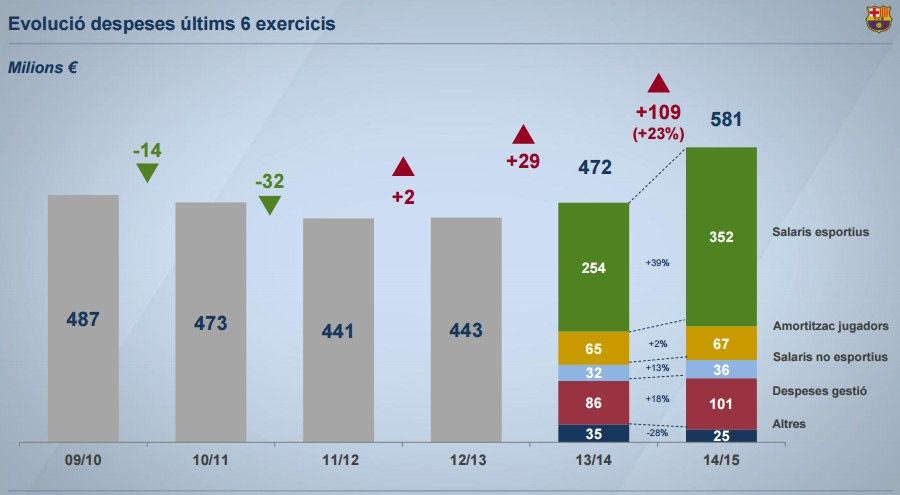 Οι Καταλανοί τρεμπλούχοι σημείωσαν έσοδα 608.000.000 ευρώ για το οικονομικό έτος που ολοκληρώθηκε στις 30 Ιουνίου 2015, ενώ ταυτόχρονα δαπάνησαν 581.000.000 ευρώ, ποσά εξωπραγματικά ακόμα και για τον χώρο του ποδοσφαίρου.