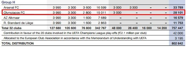 Αρχικά οι “ερυθρόλευκοι” θα πάρουν τα 12.000.000 ευρώ από τη συμμετοχή τους στους ομίλους της διοργάνωσης. Από εκεί με τις τρεις νίκες που πέτυχαν θα εισπράξουν άλλα (3×1.500.000) 4.500.000 ευρώ. Σύνολο δηλαδή 16.500.000 ευρώ. Σε αυτό το ποσό θα πρέπει να προσθέσουμε τα 12.000.000 ευρώ που θα εισπράξει από το market pool της UEFA ως μοναδικός εκπρόσωπος της Ελλάδας στο Champions League.