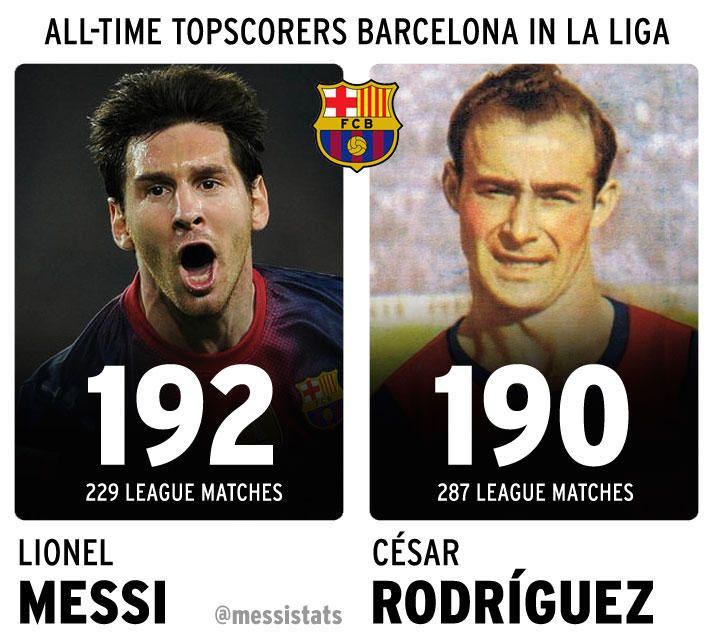 Ο κορυφαίος ποδοσφαιριστής του κόσμου τα τελευταία 3 χρόνια και διεκδικητής της “Χρυσής Μπάλας” κατέρριψε και ένα ακόμα ιστορικό ρεκόρ, το οποίο αφορά το σύλλογό του. Συγκεκριμένα, έφτασε τα 192 στο πρωτάθλημα σε 229 ματς με τη φανέλα των Καταλανών και ξεπέρασε τον μέχρι πρότινος αρχισκόρερ σε αυτήν την κατηγορία, Θέσαρ Ροδρίγκεθ, που μετρούσε 190 γκολ σε 287 ματς.