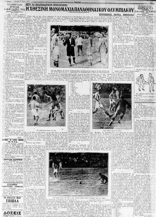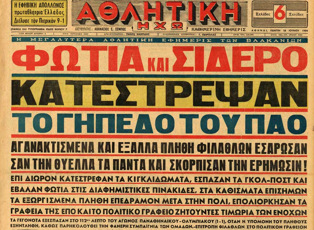 Το πρωτοσέλιδο της Αθλητικής Ηχούς μετά την καταστροφή του γηπέδου της Λεωφόρου Αλεξάνδρας από αγανακτισμένους οπαδούς του Παναθηναϊκού και του Ολυμπιακού, οι οποίοι πίστευαν ότι ο ημιτελικός Κυπέλλου είναι σικέ.