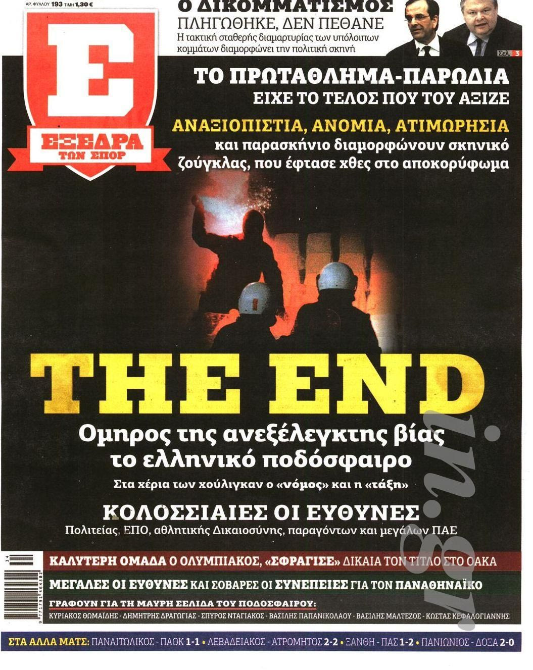 Μαύρο το πρωτοσέλιδο της Εξέδρας εξαιτίας των σοβαρών επεισοδίων που προκάλεσαν οι οπαδοί του Παναθηναϊκού και είχαν ως αποτέλεσμα να μην τελειώσει ποτέ το ντέρμπι με τον Ολυμπιακό.