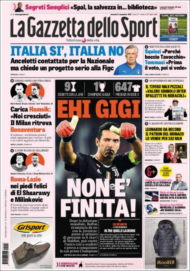“Ε Τζίτζι, δεν έχει τελειώσει”, είναι ο σχετικός τίτλος, με την ιταλική εφημερίδα να αναφέρει πως ο Μπουφόν σκοπεύει: στο ρεκόρ των περισσότερων συμμετοχών στη Serie A του Πάολο Μαλντίνι (έχει 620 και η σημαία της Μίλαν σταμάτησε στις 647), στο να γίνει ο μοναδικός που θα έχει κατακτήσει 9 πρωταθλήματα (έχει 8 όπως οι Φεράρι, Φουρίνο και Ροσέτα) και φυσικά στο να κατακτήσει το Champions League μετά από τρεις χαμένους τελικούς…