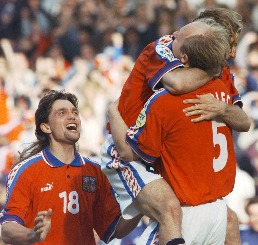Ωστόσο θα συμφωνήσουμε όλοι μαζί πως για την ελληνική επιχειρηματολογία δουλεύει ως το καλύτερο αντιπαράδειγμα του θεωρήματος των Τσέχων ότι ο αποκλεισμός τους στον ημιτελικό του 2004 από το “αργυρό γκολ” του θεού Δέλλα ήταν μία από τις πιο βαρυσήμαντες αδικίες στην ιστορία του παγκόσμιου ποδοσφαίρου. Όχι δα. Αντίστοιχα έπραξαν αυτοί 8 χρόνια νωρίτερα. Διέθεταν ένα σύνολο με φτασμένους ποδοσφαιριστές με εμπειρία από Παγκόσμιο Κύπελλο μάλιστα (που έπαιζαν κυρίως στη Γερμανία) και μερικά μελλοντικά αστέρια του ευρωπαϊκού στερεώματος (Νέντβεντ, Πομπόρσκι, Μπέργκερ, Σμίτσερ), αλλά στον ημιτελικό με τους Γάλλους έπαιξαν όπως άρμοζε σ’ ένα αουτσάιντερ: πίσω από την μπάλα, με αλληλοκαλύψεις και σωστά τρεξίματα, ψάχνοντας στην κόντρα τις στιγμές τους. Η τύχη τούς ευνόησε (δοκάρι Τζορκαέφ, χαμένη ευκαιρία Μπλαν, κακό πέναλτι Πεντρός) και πανηγύρισαν όχι άδικα την πρόκριση. Απλώς αυτοί δεν είχαν Χαριστέα στον τελικό που ακολούθησε με τους Γερμανούς.