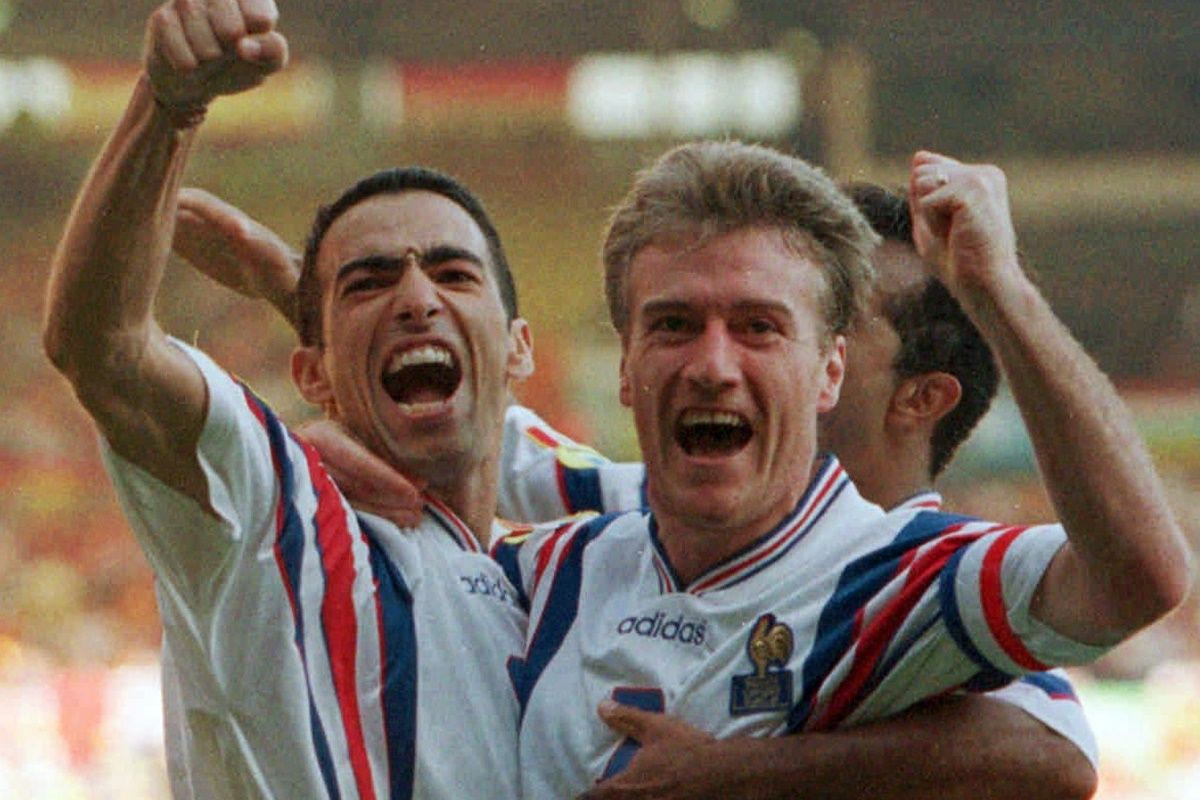 Ο Γιούρι Τζορκαέφ (αριστερά) και ο Ντιντιέ Ντεσάμπ (δεξιά) της Γαλλίας πανηγυρίζουν σε αναμέτρηση με την Ισπανία για τη φάση των ομίλων του Euro 1996 στο 'Έλαντ Ρόουντ', Λιντς, Σάββατο 15 Ιουνίου 1996 AP Photo/Dusan Vranic