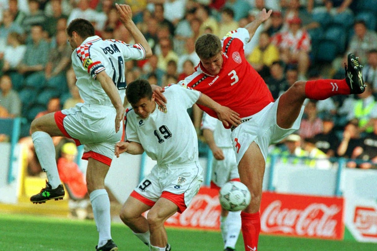 Ο Ζβόνιμιρ Μπόμπαν και ο Γκόραν Βλάοβιτς της Κροατίας μονομαχούν με τον Μαρκ Ρίπερ της Δανίας στο πλαίσιο της φάσης των ομίλων του Euro 1996 στο 'Χίλσμπορο', Σέφιλντ, Κυριακή 16 Ιουνίου 1996 AP Photo/Dusan Vranic