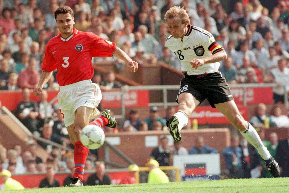 Ο Γίργκεν Κλίνσμαν της Γερμανίας σε στιγμιότυπο της αναμέτρησης με τη Ρωσία για τη φάση των ομίλων του Euro 1996 στο 'Όλντ Τράφορντ', Μάντσεστερ, Κυριακή 16 Ιουνίου 1996 AP Photo/Michael Probst