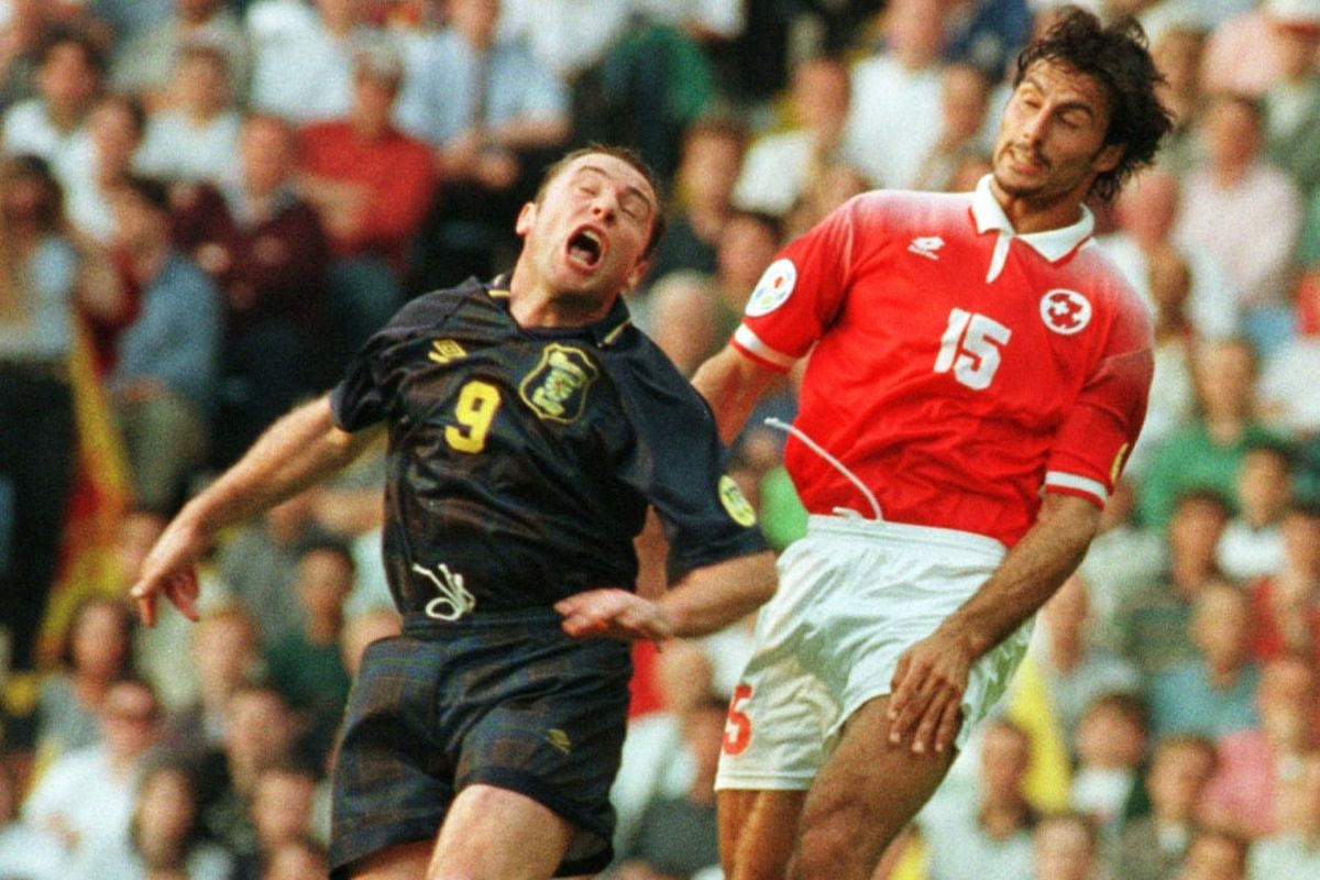 Ο Άλι Μακόιστ της Σκωτίας μονομαχεί με τον Ραμόν Βέγκα της Ελβετίας για τη φάση των ομίλων του Euro 1996 στο 'Βίλα Παρκ', Μπέρμιγχαμ, Τρίτη 18 Ιουνίου 1996 AP Photo/Santiago Lyon