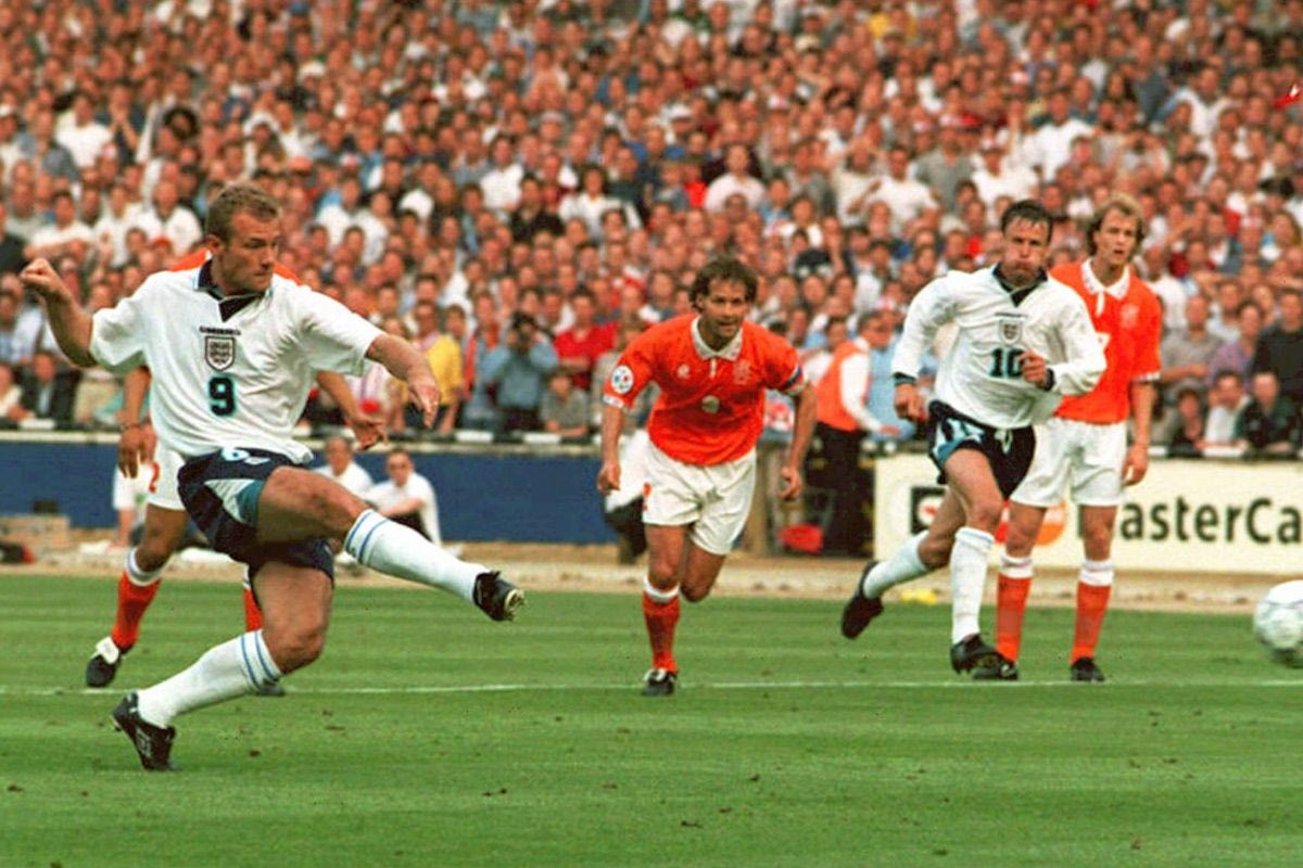 Ο Άλαν Σίρερ της Αγγλίας σε στιγμιότυπο της αναμέτρησης με την Ολλανδία για τη φάση των ομίλων του Euro 1996 στο 'Γουέμπλεϊ', Λονδίνο, Τρίτη 18 Ιουνίου 1996 AP Photo/Neil Munns