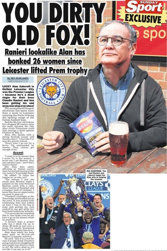 Ο 56χρονος Σκωτσέζος λοιπόν ηλεκτρολόγος ονόματι Άλαν Άσκοφτ που μοιάζει απίστευτα με τον Ρανιέρι, αποκάλυψε με συνέντευξή του στην “Sunday Sport” ότι από τότε που η Λέστερ πανηγύρισε τον πρώτο τίτλο στην ιστορία της εκείνος επωφελήθηκε από την ομοιότητά του με τον προπονητή της για να… ρίξει στο κρεβάτι του 26 γυναίκες!
