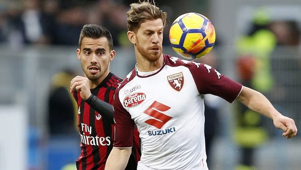 AC Milan's Suso, left, and Torino's Cristian Ansaldi keep their eyes on the ball during a Serie A soccer match at the San Siro stadium in Milan, Italy, Sunday, Nov. 26, 2017. (AP Photo/Antonio Calanni) AP Photo/Antonio Calanni