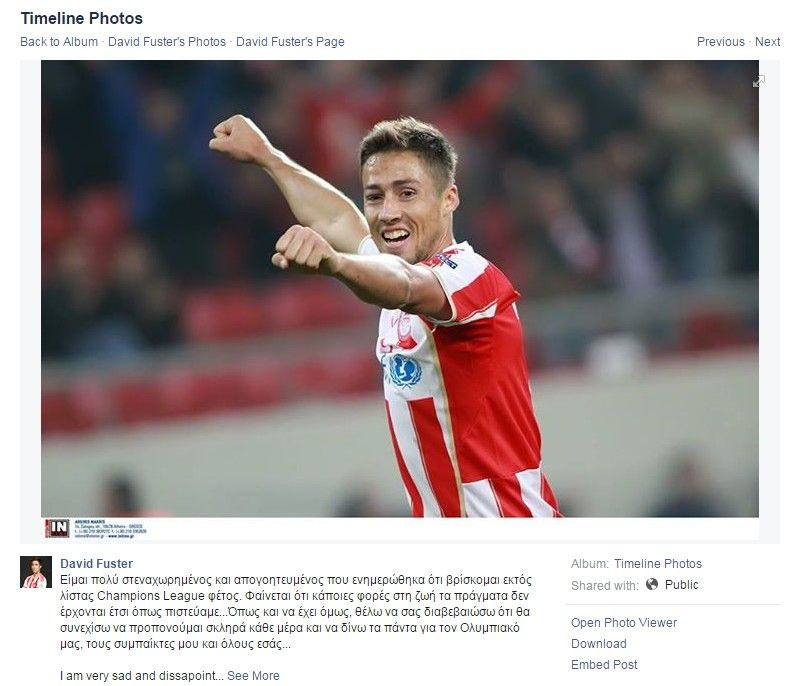 Τη δική του απάντηση για τη μη συμμετοχή του στη λίστα του Ολυμπιακού στο Champions League έστειλε με ανακοίνωσή του στο facebook ο Νταβίντ Φουστέρ.