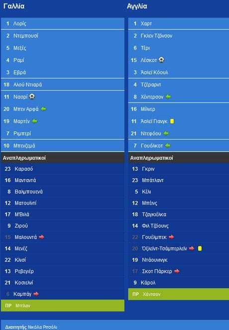 Το 1-1 δεν έδειξε να προβληματίζει την Αγγλία, η οποία δεν τροποποίησε ουδόλως τον τρόπο αντιμετώπισης του αγώνα. Δεν ήθελε να χάσει και αυτό υπηρέτησε στο χορτάρι, στερώντας παράλληλα από τη Γαλλία το δικαίωμα να διεκδικήσει τη νίκη. Γιατί ναι μεν οι “πετεινοί” λειτούργησαν καλύτερα ως σύνολο, ήταν δραστήριοι και ενεργητικοί, τους έλειψε όμως η καλή τελική προσπάθεια. Στα σουτ του Μπενζεμά στο 65′ και του Ριμπερί στο 75′ ο Χαρτ είχε σωστές τοποθετήσεις, ενώ εκείνο του Καμπάιγ στο 80′ κόντραρε και έφυγε εκτός.