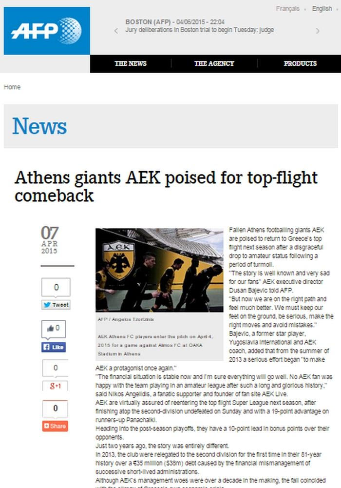 “Η ΑΕΚ, το μεγαθήριο της Αθήνας, είναι έτοιμη για επιστροφή στην πρώτη κατηγορία”, αναφέρει ο τίτλος του AFP, που φιλοξενεί παράλληλα και δηλώσεις του Ντούσαν Μπάγεβιτς.